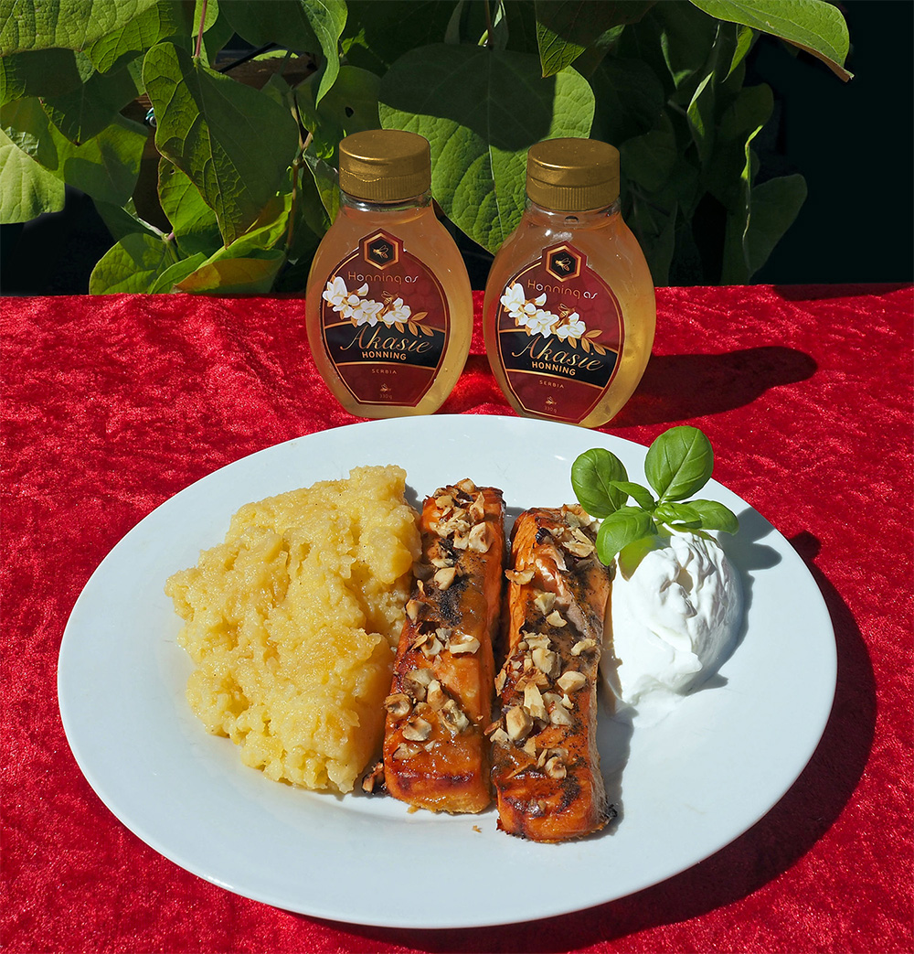 Skrell kålroten, skjær den i grove biter og kok det mørt i godt saltet vann. Sil av og mos kålroten med smøret. Smak til med salt og pepper. Bland sennep og honning og smør det på laksen. Hakk nøttene og strø dem på fisken. Ha på salt og pepper. Bak i ovnen på 180 grader i ca 20 minutter. Bruker du steketermometer skal fisken bli 50 grader. Server fisken med kålrabistappe, kokte potetereller ris. Ha gjerne på litt frisk dill.